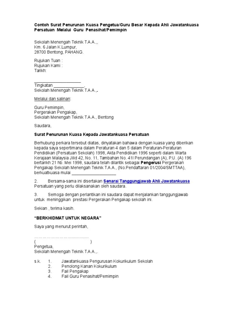 Lampiran 11 contoh surat penurunan kuasa pengetua/guru besar kepada ahli jawatankuasa persatuan melalui guru penasihat/pemimpin sekolah kebangsaan kampong .